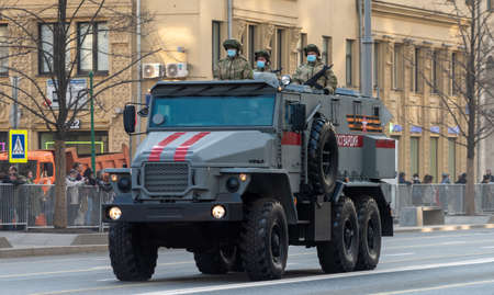 April 30, 2021 Moscow, Russia. Ural Armored car of the Russian National Guard on Tverskaya Street in Moscow.