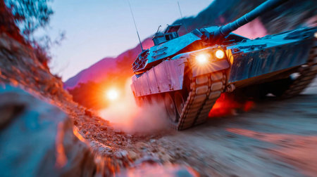 Powerful modern tank speeding through dusty terrain at sunset, symbolizing strength, defense, and military force.