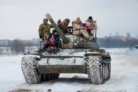 KRASNOYE SELO, RUSSIA - FEBRUARY 19, 2023: Visitors to the Steel Landing military historical park ride a Soviet tank of T-54 on a February afternoon