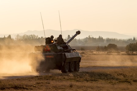 Tankers of the foreign Legion race on a tank on maneuvers along a country road. The South Of France