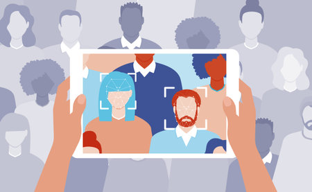 Biometric identification by gadget. Facial recognition technology scan and detect people face for identification. Digital biometric security system that analyze human face to verify personal data.