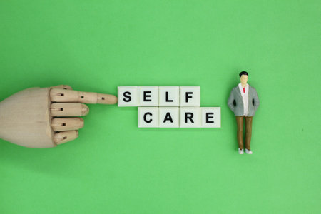 Self care words printed on wooden blocks, self treatment concept, pink background
