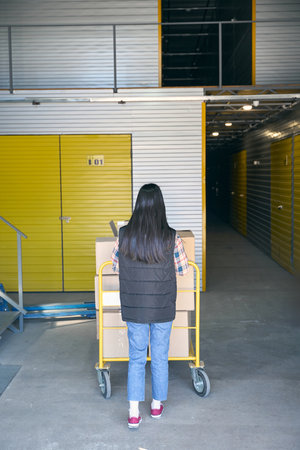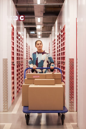 Worker transporting wares on wheeled cart in warehouse