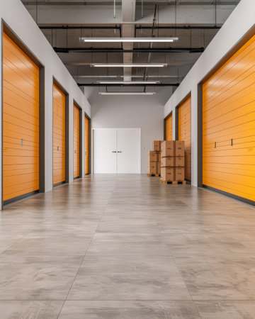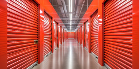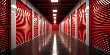 Modern Self Storage Facility Interior with Red Metal Doors and Long Perspective Corridor