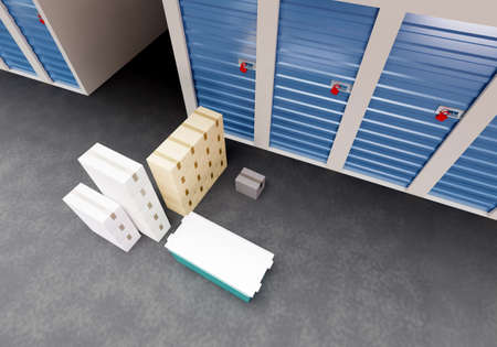 Top view of the self-storage corridor. Boxes near the self-storage unit door. Storage of things in a rented warehouse. Warehouse complexes. Warehouse business. Storage services. 3d image
