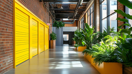 A vibrant urban office corridor featuring yellow storage doors and greenery creating an inviting workspace.