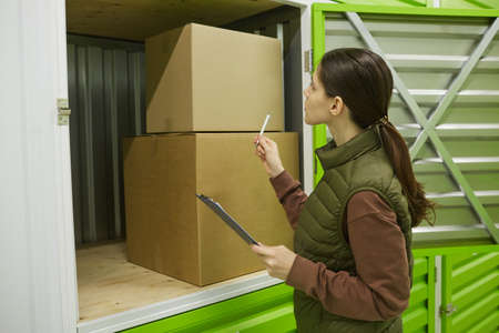 Cheerful young woman searching for unit she rents in self-storage