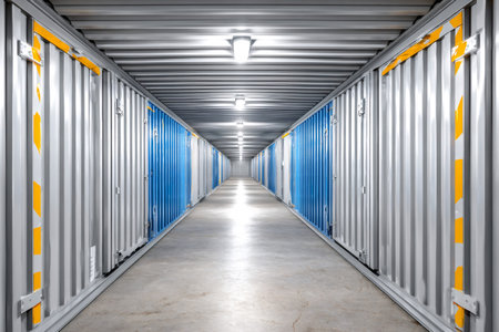 Long corridor created by storage units, illuminated by artificial lights, offering secure storage space