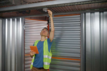 Male warehouse worker checking garage lock