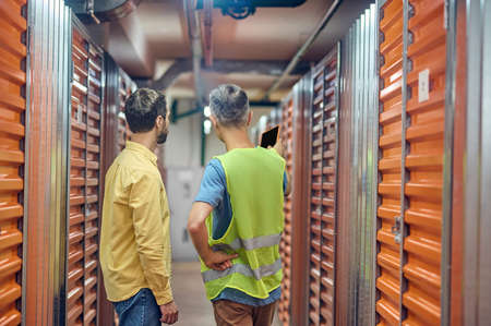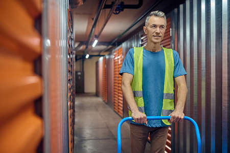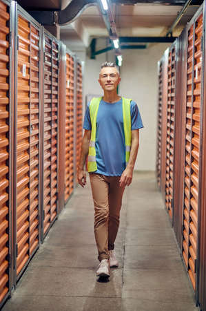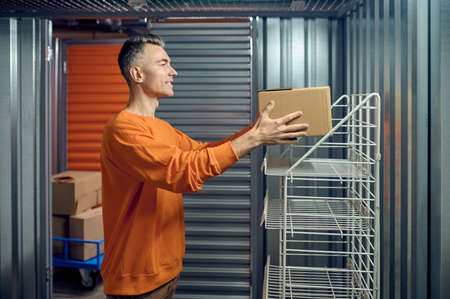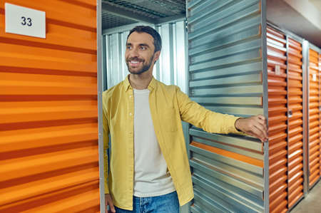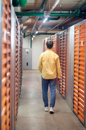 Side view of young guy in work clothes into warehouse with self-storage unit