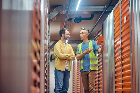 Two men talking in warehouse between garages
