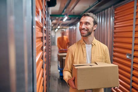 Smiling mature man with cardboard box standing in self-storage where he rents unit
