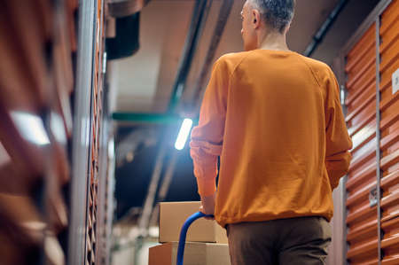 Middle aged Caucasian man pushing stack of cardboard boxes on dolly cart through hallway lined with green storage unit doors, focusing on transporting belongings in self storage facility