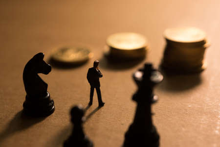 Concept of financial business competition. Businessman thinking with Chess pawn and coins stack.