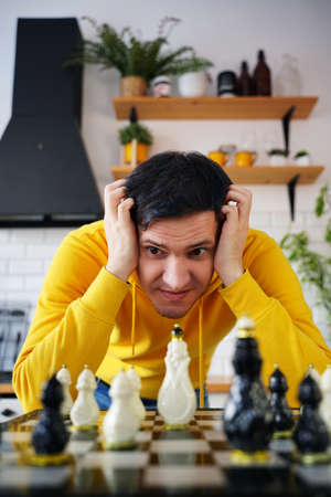 Young thoughtful man playing chess on kitchen table. Pensive male plays in logical board game with himself, standing in kitchen