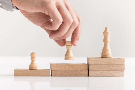 Businessman placing chess pieces on wooden blocks arranged as steps in a concept of corporate success in business, career and entrepreneurship in a close up view.
