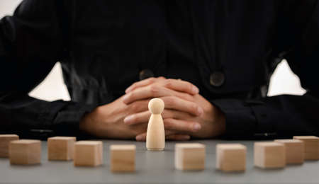 wooden doll among wood block with businesswoman on background, planning and strategy concept