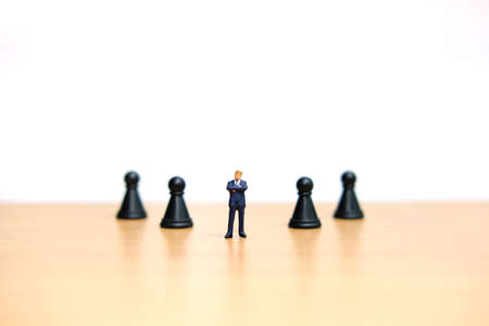 Miniature people strategic concept - businessman standing between castle pawn