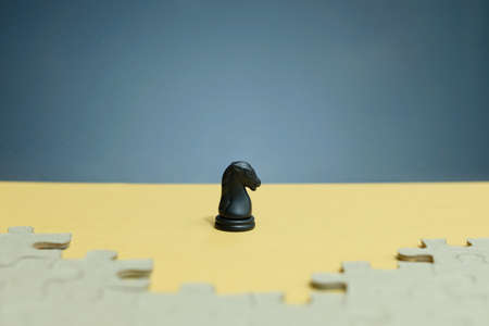 Business strategy conceptual photo - horse knight standing in front of jigsaw piece puzzle