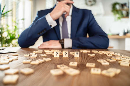 Wooden question marks on the table with businessman in the background. Conceptual photo. FAQ. Business. Economy.
