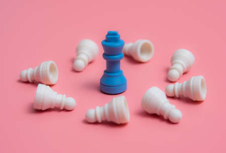 Leader success concept,Blue chess king win vs white pawns