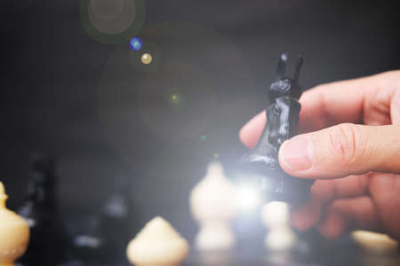 Close-up of a man playing chess on a dark background. The concept of business, strategy, leadership and success.