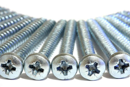 Close up photo of screws, set of screws in a construction abstraction. Industrial background with screws on a white board