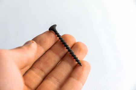 Image with sekected focus on the some screws are on the working surface for plasterboard - drywall -for gypsum walls in apartment is under construction, remodeling, renovation, extension, restoration and reconstruction.