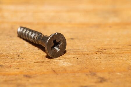 Metal Black self-tapping Screws on wooden background. Close up stock photo.