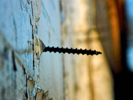 A single, gleaming metal screw lies ready for use on a heavily rusted and weathered surface.