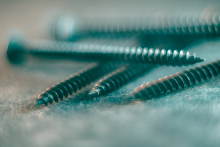 Steel self tapping screws, close up, tinted, shallow depth of sharpness