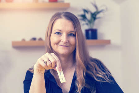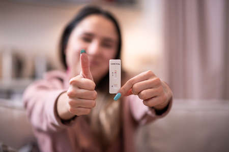 Smiling woman is showing negative result of preventive control of by a self-testing kit at home. Horizontally.