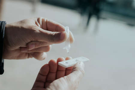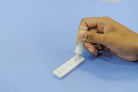 Drop of a test material in a rapid test cassettee for covid-19 antigen test. Medical care concept