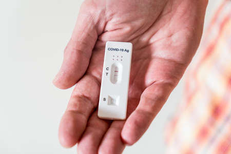 COVID 19, a man holding a negative antigen test in his hand, close-up.