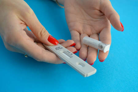a girl with a bright red manicure holds a coronavirus test in her hand. a lancet for a blood test is nearby. determination of antibodies. detection of antibodies for immunity from coronavirus.