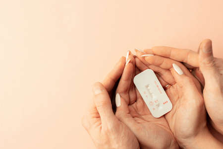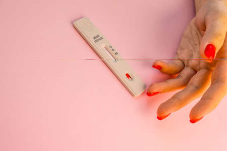 Pregnancy test kit. Female hand hold positive pregnant test with silk ribbon on pink background. Medical healthcare gynecological, pregnancy fertility maternity people concept