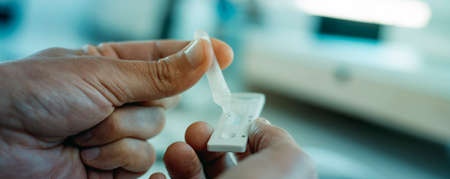 isolated shot of a palm of a right hand with a rapid express antigen