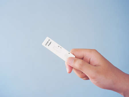 Human hand holding empty ATK or antigent test kit for Covid-19 over blue background.