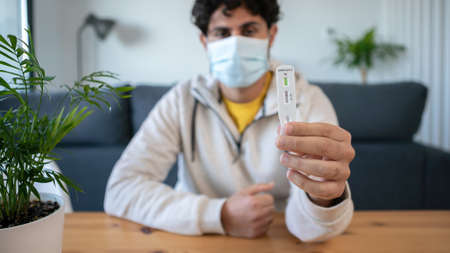 man holding Rapid Antigen Test kit with Positive result during swab COVID-19 testing. Coronavirus Self nasal or Home test, Lockdown and Home Isolation concept