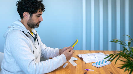 A sad caucasian man makes a rapid home test device