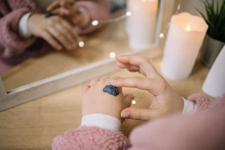 Female hands applying cream on the back of the palm. Mirrored image with close up of female hands applying mud cream on the back of the palm