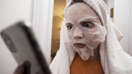 Portrait of a young girl with a towel on her head and a fabric face mask on her head looking at smartphone. Action. Teenager girl looking shocked and angry, getting bad news.