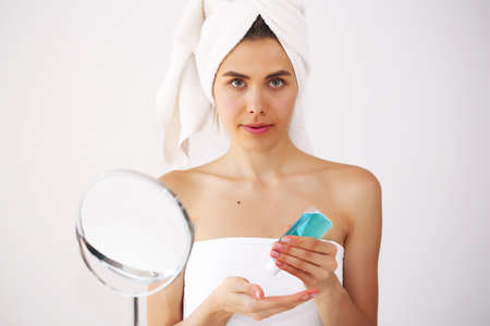 Woman cleaning her skin and applying moisturizer, while looking at the mirror