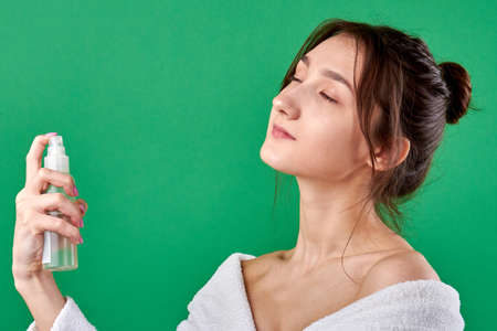 Girls spraying perfume on her face. Womans applying spray on her face isolated on green chromakey background.