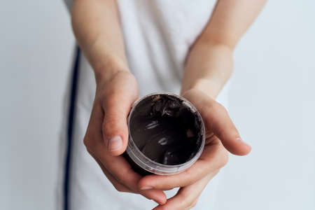 man squeezing a jar of exfoliating and putting the required amount on his fingers. a skin care routine