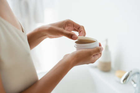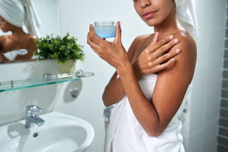 Cropped photo of young woman moisturizing cream on her hand as part of everyday skincare routine, standing in front of mirror in bathroom. Beauty, wellness and bodycare concept