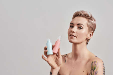 New Beauty. Portrait of beautiful tattooed woman with pierced nose and short hair holding plastic bottles with cosmetic, hair and skin care products, isolated over grey background