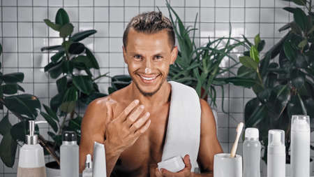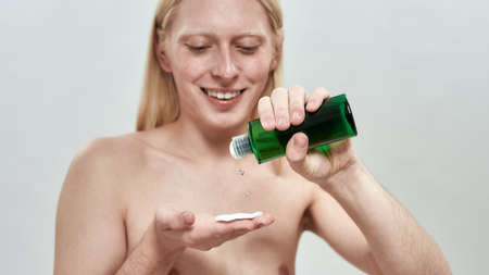 Happy caucasian shirtless man smiling while applying face cream isolated over black background