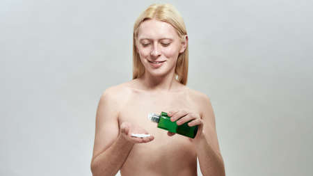 Portrait of beautiful half naked tattooed woman with short hair holding white plastic jar of cream or body lotion isolated over blue background