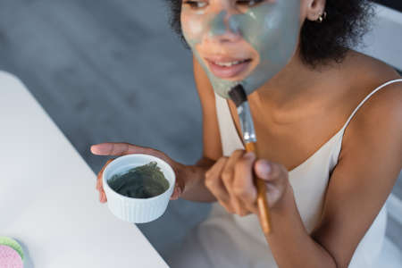 Cropped view of african american woman holding jar with eye patches in bathroom
